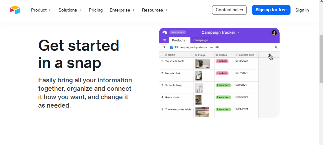 - Product: Airtable allows users to add anything into the spreadsheet cells including files, images, etc. They can then turn that spreadsheet into a calendar, event planning, product roadmap, etc.